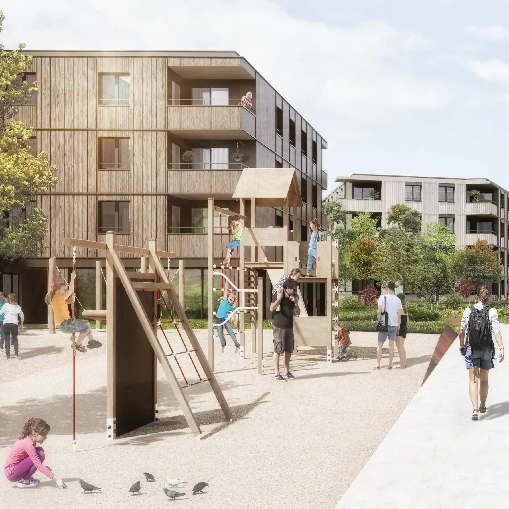 Ce quartier, pensé comme un véritable morceau de ville, allie qualité de vie, mixité des usages et responsabilité environnementale. Il s’inscrit dans une démarche de durabilité exigeante, certifiée SEED et labellisée Minergie-P-Eco, sans imposer un cadre rigide à ses habitants.